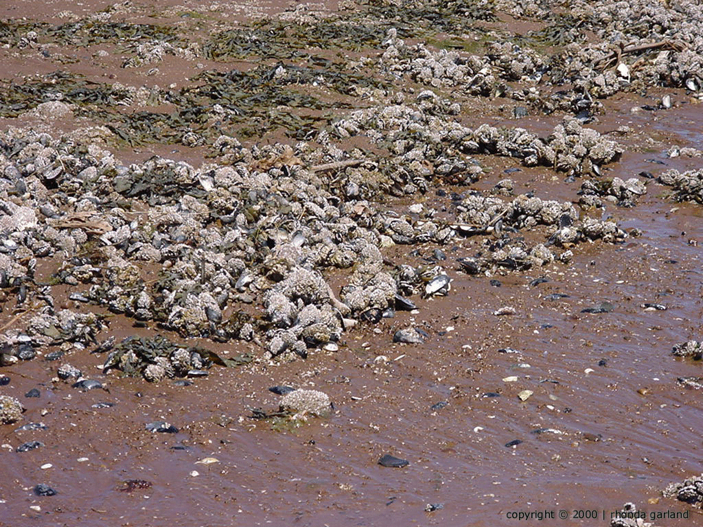 Blue mussels (Mytilus edulis) are common on rocky shores. Mussels attach themselves to the substrate by secreting byssal threads. They are not normally found on sandy or muddy shores because the substrate is not stable enough to act as an attachment site. Although it appears that the mussels have attached themselves to the sand in this area, in reality, they are attached to sandstone rocks buried beneath the surface. Other mussels then attach themselves to the first mussels forming long chains of mussels that lie on the sand. Mussels are filter feeders, eating food particles captured from the water as it flows through the mantle cavity. Mussels begin spawning in late winter and continue through spring & into late winter and continue through spring and into summer. The larvae are free swimming for several weeks, after which they settle to the substrate and secrete byssal threads to attach themselves. Although mussels are common in the inter-tidal zone, they are also found in sub-tidal areas to depths of 60 m. Because they are constantly submerged (and can feed for longer periods of time), sub-tidal mussel grow more quickly than those in the inter-tidal zone. Because mussels are limited by available attachment sites, mussel farmers can greatly increase the productivity of an area by providing nets or lines on which mussel larvae can settle. Mussels are eaten by a wide variety of animals including: crabs, sea urchins, sea stars, moon snails, gulls, sea ducks, marine mammals an dog whelks. Look for empty shells with 2 or 3 mm holes drilled in them. These were eaten by dog whelks.