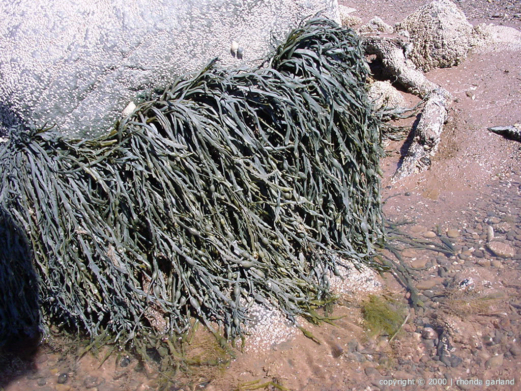 Knotted Wrack (Ascophyllum nodosum) - a brown alga. The blades are narrow with no midrib and contain air bladders for floatation. Rich in nitrogen, phosphorous and potassium and is often collected and spread over gardens as a fertilizer. Also a source of algin like many other brown algae. Algin is a gelling compound that is used in many foods such as dairy products and salad dressings.