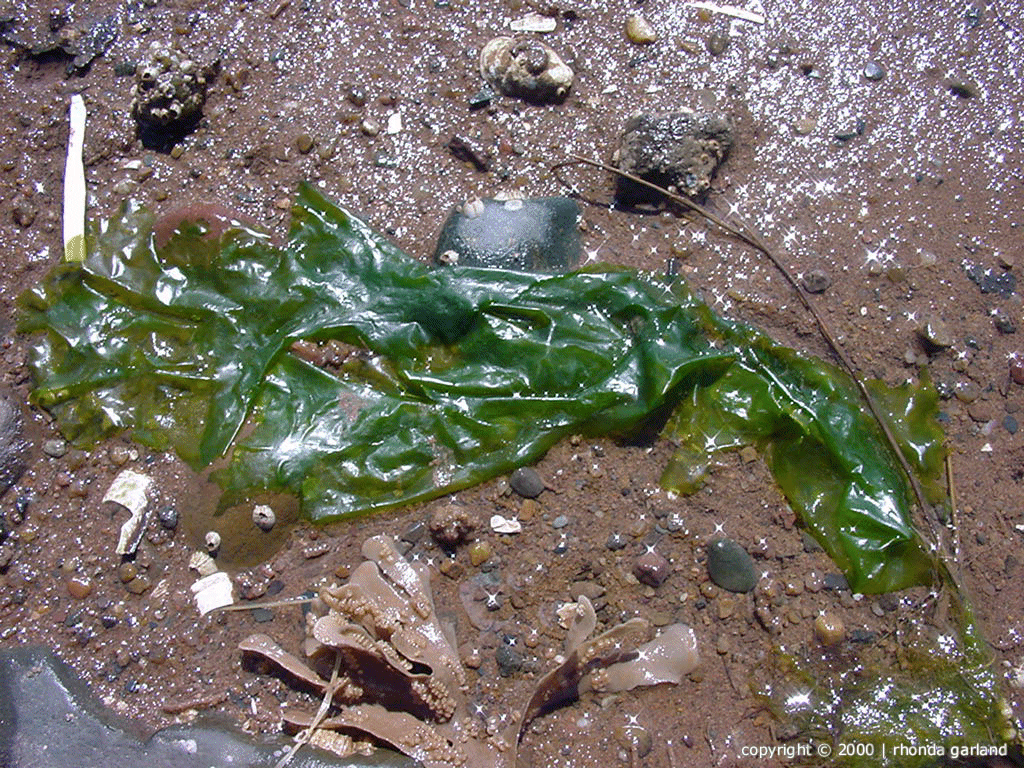 Sea Lettuce (Ulva lactuca) - a green alga with broad flat blades that are bright green in colour. It actually looks like lettuce leaves but much thinner. It is edible and may be used in soups and salads. It is eaten by many organisms including various snails and fish.