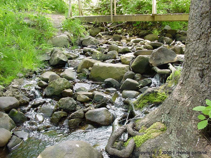 In the pools on both sides of the bridge water striders skate on the surface of the water. These long-legged insects are able to walk on the surface of the water because water has a very high surface tension. Surface tension is caused by cohesion of water molecules to one another by hydrogen bonds. (Water has the highest cohesive force of any liquid except that of mercury). At the air-water interface, the water molecules are H-bonded to one another and to the water molecules below the surface. This makes the water behave as though it were coated with an invisible film. So long as the weight of the insect is not great enough to break the cohesive forces among water molecules, the insect can walk on the surface.