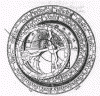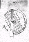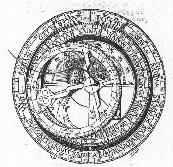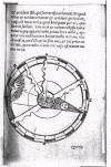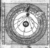Because it is not obvious how the ability to move a volvelle relative to the background would be retained if the former part were glued to the latter, I should explain that the volvelles themselves were not actually glued in. Rather, the page on which the volvelles were printed would also have smaller, decorative circles designed to be used as glue caps. The volvelle itself would have a circle cut out in its centre, and the decorative cap would be glued through that cut-out to the leaf in the book. As a result the volvelle could be rotated while the cap was glued stationary on the background. Alternatively, the volvelles were often tied to the background image by being sewn through the centre of the image such that they could rotate around the centre formed by the string. In these cases the decorative caps were often glued directly to the uppermost volvelle, assumably to prevent the string from untying, or from wearing a hole in the leaf next the one on which the background was printed. I have seen texts in which the compositor left an empty space on the reverse side of the background image so that a protective cap could be glued over the string end for this purpose without covering proximate text. As will be seen in other sections of this article, some of the images I am trying to describe are very complex and multi-layered. I have seen movable images with as many as four layers of volvelles tied in above the background image, each volvelle free to rotate independently of the background and of all other volvelles in the image.
