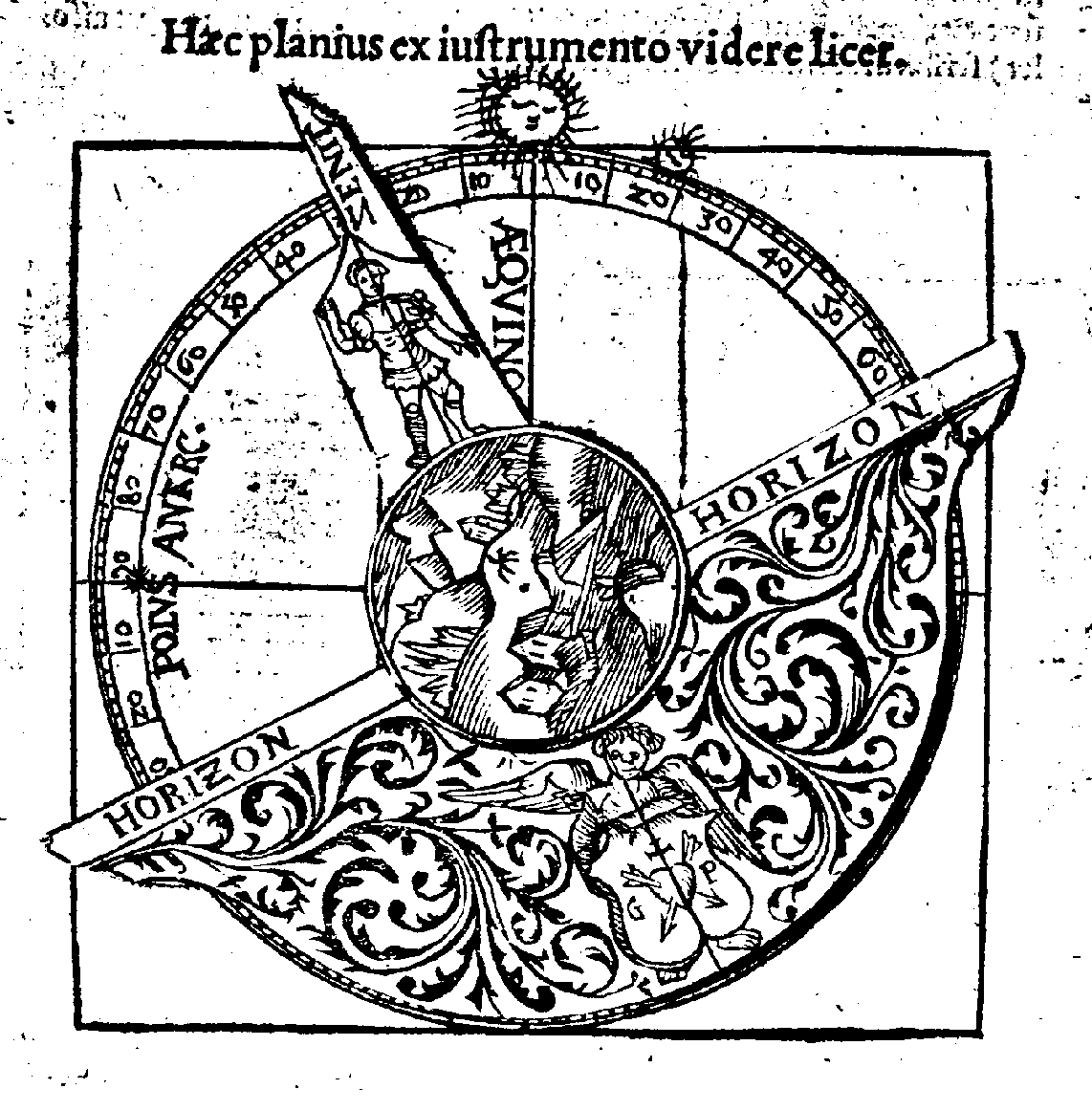 The examples I provide are sixteenth century texts attributed to Johannes Sacrobosco (d.1256), Peter Apian (1495 - 1552), and Richard Eden (c.1520 - 1576). A copy of each of these texts is held in the Dibner Library of the History of Science and Technology in the Smithsonian Institution's National Museum of American History, and the images to be found in this paper are reproduced either from Dibner texts, or from the Folger Shakespeare Library's copy of the 1584 edition of The Arte of Navigation, or they have been created using Macromedia software from Dibner reproductions. I spent two months in the Dibner Library in 2001 thanks to the generous support of a Smithsonian Instution Libraries / Dibner Library Resident Scholarship. Also in 2001, I was able to examine copies of Richard Eden's The Arte of Navigation held in the Folger Shakespeare Library and in the Lennox Collection of the New York Public Library thanks to the Izaak Walton Killam Foundation and the Social Sciences and Humanities Research Council of Canada. Since that time I have been able to develop the digital edition linked from section 4.0, below, through the assistance of the McConnell Family Foundation and Acadia University, and especially Acadia University's Institute for Teaching and Technology (AITT). The digital edition-in-progress of The Arte of Navigation to which readers can link from section 4.0 allows construction of moveable images in a manner meant to mimic, as closely as possible, the similar task demanded of readers of the original, sixteenth-century, texts. The graphical representation of the various parts of these images was done by Janice Hudson while she was an undergraduate in Acadia's Department of English, and by Katie Marshall, a student in the Biology Department. The images were animated by two Computing Science students, Trevor Dawe and Jamie Chang. I was put in contact with these exceptional students by the AITT.